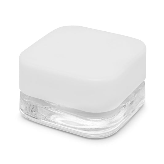9ml Cube Glass Jars w/ Shoulderless Screw Top & Child Resistant Lid (Clear Glass, White Lid) | 100pc Carton